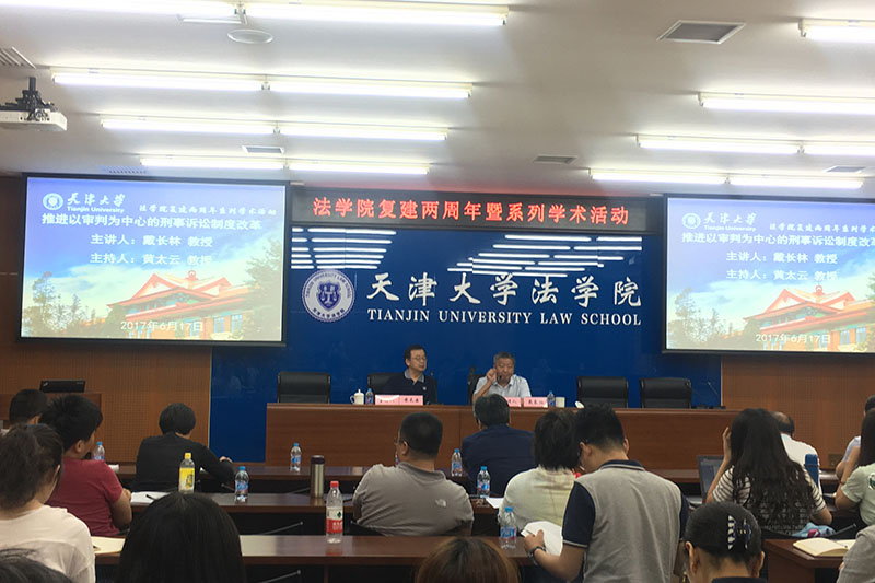 本站讯(通讯员 杨宁 贾瑞 毛星)为庆祝学院复建两周年,2017年06月17日,戴长林教授来到我院为广大师生举行了一场题为“推进以审判为中心的刑事诉讼制度改革”的学术讲座。讲座由天津大学法学院黄太云教授主持。来自天津市高级人民法院、天津市各区法院、天津市高级检察院等实务部门的同志、天津市各兄弟高校和我院师生共计80余人聆听此次讲座。