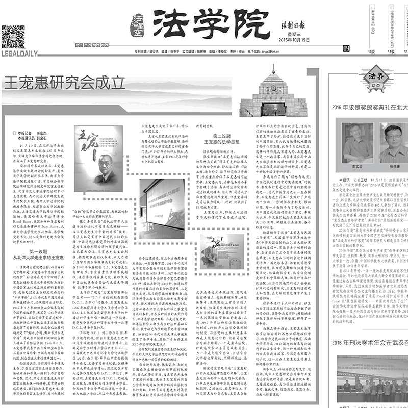 王宠惠研究会的成立在法学界引起强烈反响。法制日报专版报道了天津大学成立王宠惠研究会以及王宠惠学术成就研讨会的盛况。