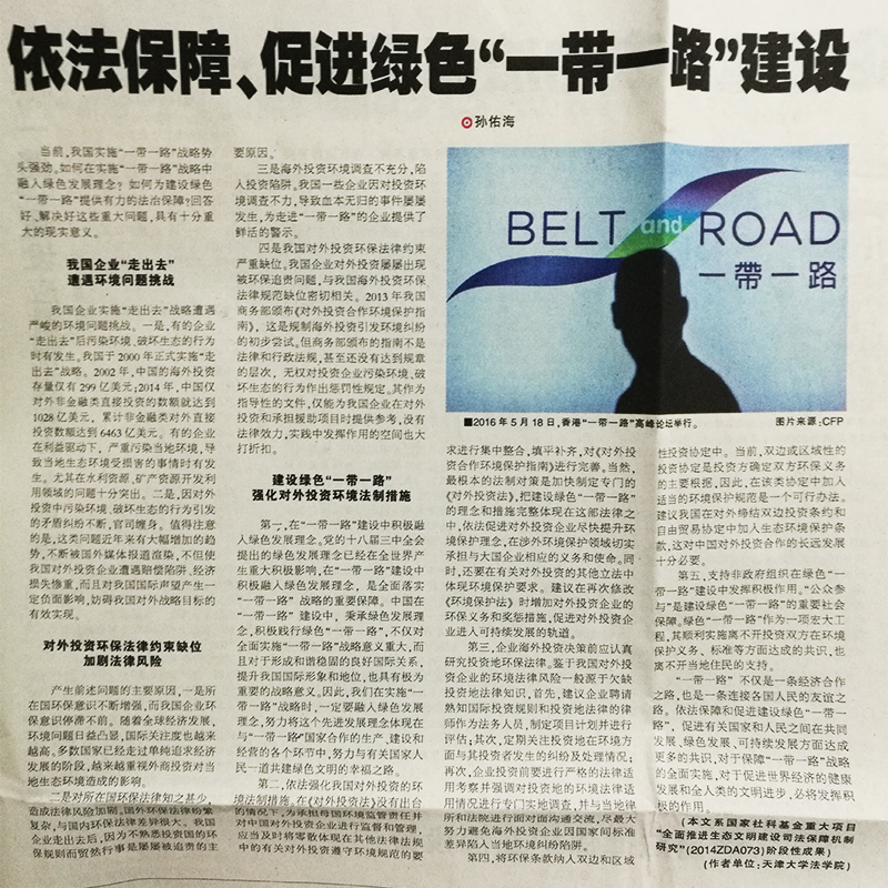 依法保障、促进绿色“一带一路”建设——《中国社会科学报》理论版刊发孙佑海院长文章