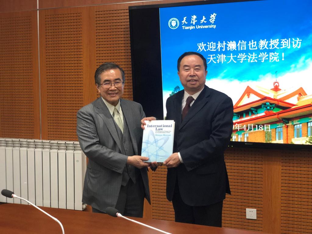 村濑教授向天津大学法学院赠送其著作《International Law:An Integrative Perspective on Transboundary Issues》和《国际立法—国际法的法源论》。他的著作具体分析了国际法的编制过程,介绍了国际法制定的程序、发展历史等,是村濑教授数十年国际组织工作经验的结晶。村濑教授加盟天津大学法学院,有利于中日促进法学的交流,推动中国国际环境法的研究进步。