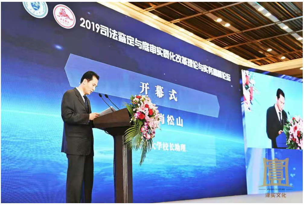 天津大学校长助理肖松山代表天津大学致辞。他指出,党的十九届四中全会提出坚持和完善中国特色社会主义制度,要求建设中国特色社会主义法治体系、建设社会主义法治国家,完善公共法律服务体系。习近平总书记在今年召开的中央政法工作会议上强调,要深化公共法律服务体系,加快整合律师、公证、司法鉴定等法律服务资源。中共中央办公厅、国务院办公厅印发的《关于加快推进公共法律服务体系化建设的意见》提出,公共法律服务是政府公共职能的重要组成部分,是保障和改善民生的重要举措,是全面依法治国的基础性、服务型和保障性工作。此次天津大学和津实司法鉴定中心联合举办“司法鉴定与庭审实质化改革理论与实务高峰论坛”是对中央政策精神的贯彻和落实,意义十分重大。他简要介绍了天津大学法学的发展情况,并指出天津大学与司法鉴定相关的学科不仅有法科,传统化工、精仪、环境等传统优势学科发展同样迅速。目前天津大学正在全面推进新工科建设和新法科建设,就是要把学校的各类优势学科和优势资源进行融合交叉,实现跨越式发展。相信依托天津大学的学科平台,法学、化学、环境和光学等各学科专业的融合发展必将为我国的司法鉴定事业作出应有的贡献。