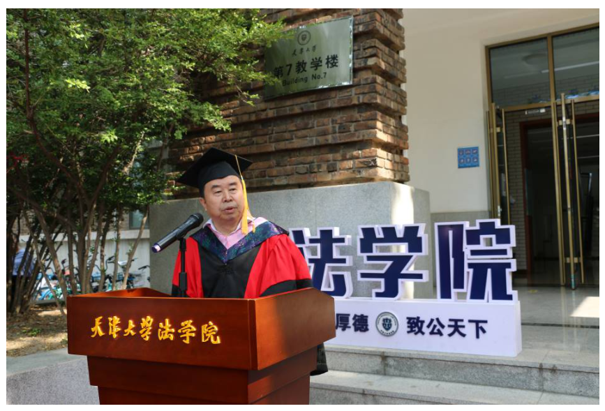 孙佑海院长讲话。他以百年未有之大变局为背景,从两位北洋法科杰出校友——中国共产党早期领导人之一张太雷同志和钦字第一号文凭获得者、法学大家王宠惠先生的生平事迹展开,劝勉同学们把握机会,完善自我。孙佑海指出,天津大学法学院五年来始终以复兴北洋法学为己任,沿着高起点、入主流、有特色、国际化的办学方针不断前行,取得了一些成绩,并于学院复建五周年之际与兄弟院校一起发起成立了法学教育创新联盟,这与全体师生的共同努力是分不开的。孙院长概括了张太雷和王宠惠两位校友之所以成为“杰出校友”的共同特点,一是学贯中西,二是才华出众,三是学以致用,四是报效国家。以上四个特点,既是他们成功的秘诀,也是全体北洋法科学人的共同财富。同时,希望全体毕业生志存高远、严于自律,作为法律人,要时刻谨记防微杜渐,坚守底线。