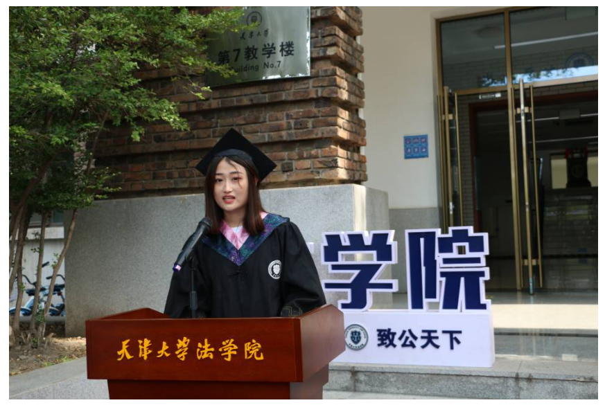 2020届本科毕业生代表张净雪发言。她向学院领导和老师表达衷心的感谢和崇高的敬意。2020届本科毕业生伴随着学院一同成长,四年里共同见证了学院的快速发展,在这里的每一天都收获满满。四年匆匆而逝,即将与北洋道别,迎接全新旅程之际,她号召大家谨记“实事求是”的校训和“崇法厚德,致公天下”的院训,开创更加美好的未来。