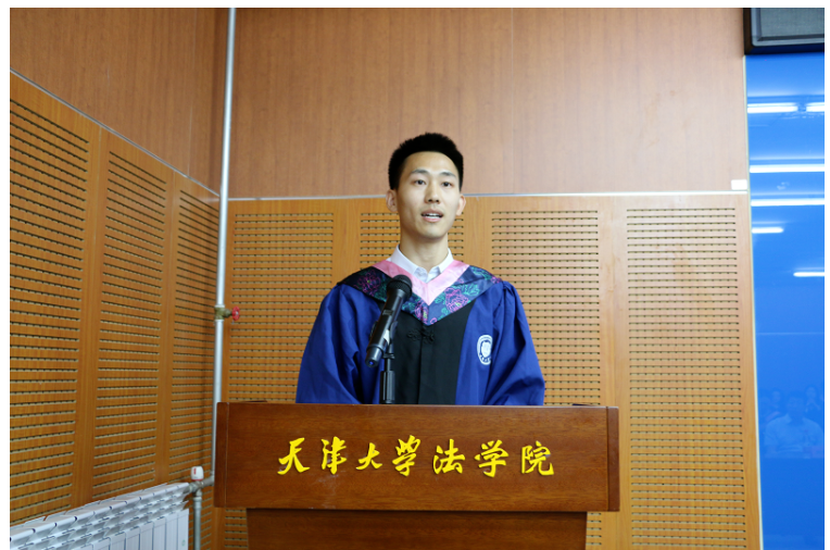 2020届研究生毕业生代表刘杰发言,他代表全体毕业生向学院领导和各位老师的陪伴和付出表示衷心的感谢和崇高的敬意。2020届研究生见证了法学院复建以来为培养新时代法治人才所付出的努力,更见证了学院在新法科建设道路上所取得的累累硕果,每一位老师和同学都为此感到骄傲和自豪。毕业总是伴随着不舍,时光匆匆而逝,即将与天大道别,迎接自己的人生新征程,他号召大家谨记“实事求是”的校训,秉承“崇法厚德、致公天下”的操守,做勇于担当、具有家国情怀的“天大人”。最后他为同学、为老师、为学院、为母校、为祖国送上真挚的祝福。
