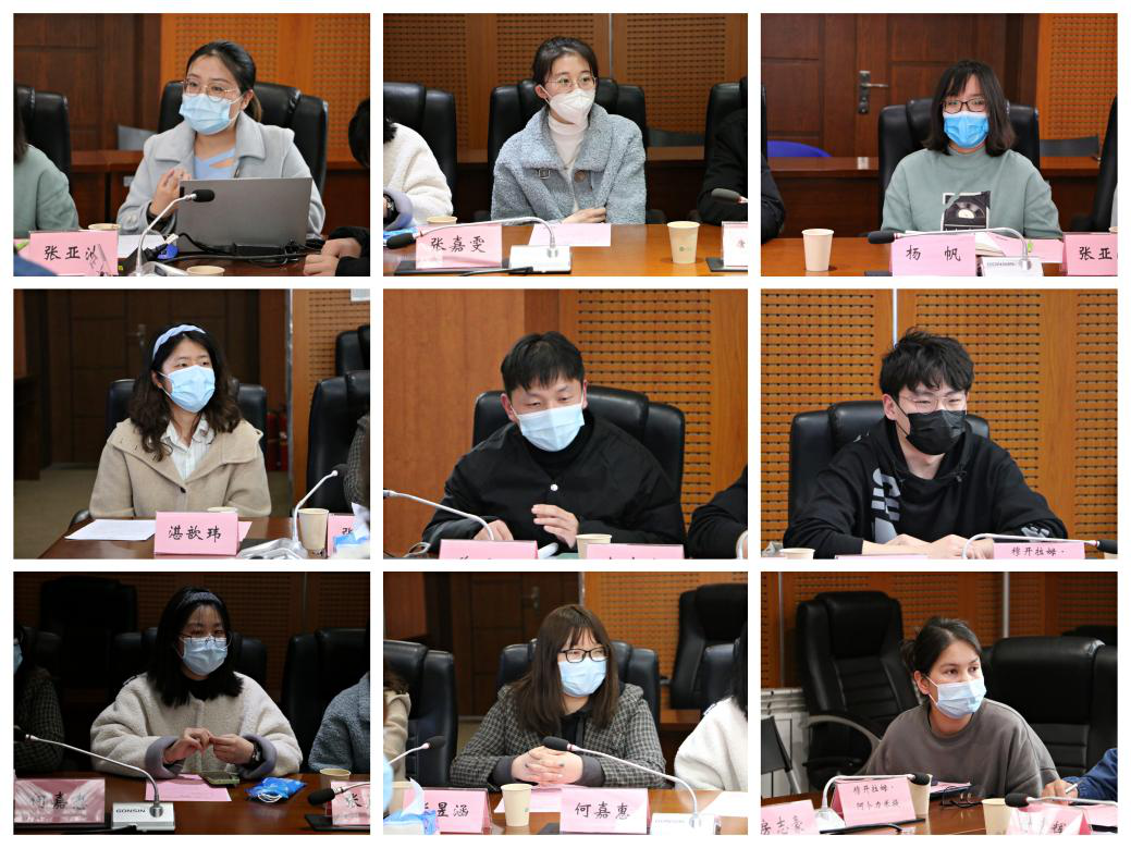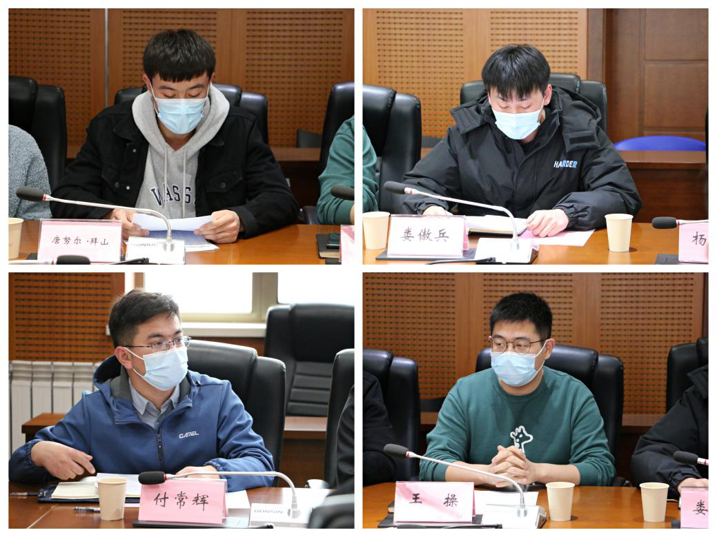 师生代表发言环节,2019级本科生唐努尔·拜山说,作为一名退役大学生士兵,自己和战友们第一时间加入学校疫情防控志愿者队伍,完成了核酸检测大筛和志愿服务等工作,在抗疫岗位上干好每一分钟。2018级本科生娄傲兵说,疫情爆发后,学院领导和老师坚守岗位,逐一走访学生宿舍,了解大家的困难和需求,讲解疫情防控政策,为同学们带来温暖和安全感,作为一名青年党员,自己将不忘初心,在磨砺中不断成长、前行。2020级博士生王操说,留校过年期间学校、学院提供了完善的学习和生活保障,导师孙佑海教授给予自己及时的学业指导,疫情虽然带来了困难和挑战,但也为平淡的学术时光赋予了别样的意义。本科生辅导员付常辉说,学院党委第一时间成立学生疫情防控工作组,领导老师靠前指挥、坚守一线,学院同时还组织了丰富多彩的主题讲座、“云端相约”、防疫扫除、志愿服务等活动,让留守学校的同学们不再孤单。