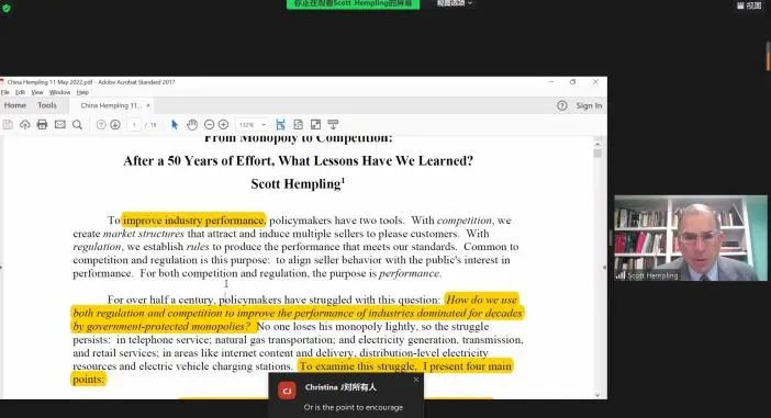 讲座伊始,Dan Guttman教授向大家隆重介绍了本期讲座的主讲嘉宾Scott Hempling教授。讲座过程中,Scott Hempling教授首先就“Public Utility、Market Structure、Regulatory Law”等专业术语进行了详细介绍。随后,Scott Hempling教授围绕四个方面对本期讲座主题进行了具体讲解和答疑:第一,将垄断产业转变为竞争性产业需要的事实和逻辑;第二,美国在电信、批发和零售电力产业所忽视的重要教训;第三,当前美国监管存在的前提性错误是,忽视了现有垄断者的持续存在如何阻碍真正竞争的产生;第四,完善监管所需要的有效监管原则。