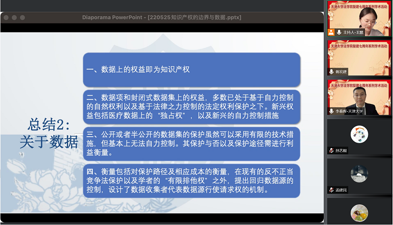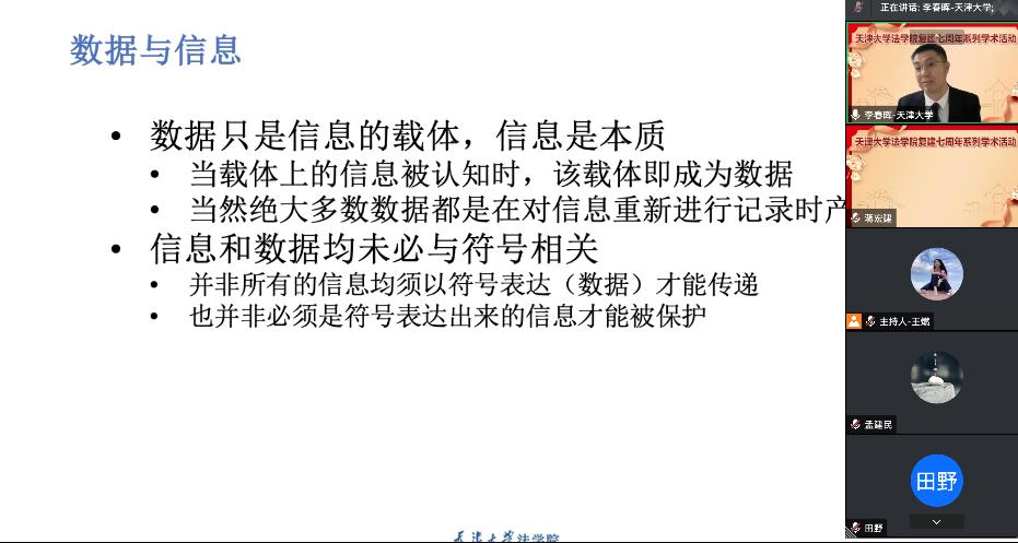 (通讯员 孙艺桐) 2022年5月26日,天津大学法学院复建七周年系列活动之“天大-国浩”计算法学系列论坛“知识产权的边界与数据”讲座成功举行。本次讲座由天津大学法学院、国浩律师(天津)事务所主办,北京大学法学博士、天津大学法学院副教授、天津大学中国智慧法治研究院研究员李春晖主讲,天津大学法学院副教授、计算法学负责人王燃主持,国浩律师(天津)事务所高级合伙人、天津市人大代表、中华全国律师协会知识产权专业委员会委员蒋宏建律师与谈。天津大学(北洋大学)法科创建于1895年,是中国现代法学高等教育的开端,2015年6月17日复建法学院。作为一个历史悠久且朝气蓬勃的学院,天大法学追求卓越,砥砺奋进,不断优化学科布局,人才培养质量不断提高,积极推动“新法科”建设。李老师用他最前沿的研究,为我们带来一场精彩的学术盛宴,同时也是用最好的面貌,迎接即将到来的法学院复建七周年!本次讲座得到了天津大学校内外师生和实务界人士的广泛关注。