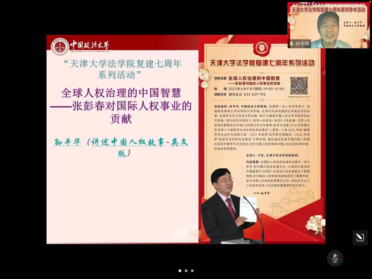 (通讯员 辛梦)2022年6月9日晚7点,中国政法大学教授孙平华应邀为天津大学法学院师生作了题为“全球人权治理的中国智慧---张彭春对国际人权事业的贡献”的学术讲座。本次讲座作为天津大学法学院复建七周年系列学术活动之一,通过在线会议的形式举办。讲座由天津大学法学院于亮副教授主持。