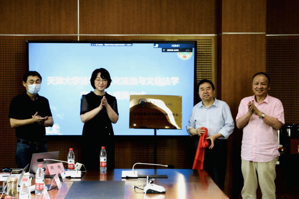 张俊艳处长,孙佑海院长,天津大学讲席教授、中国法学会立法学研究会副会长熊文钊教授,天津大学法学院教授、国家制度与国家治理研究院副院长王建学为“文化法治与文化法学研究中心”揭牌。
