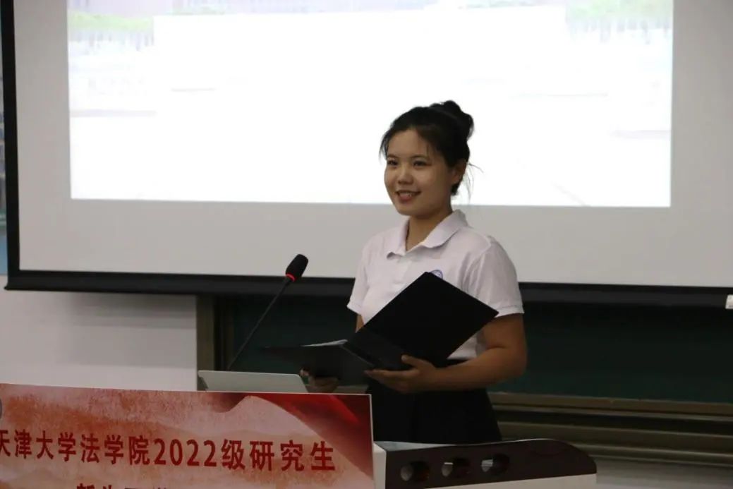 2022级全日制新生代表王芊芊发言。曾经的北洋法科是孕育国之栋梁的摇篮,现如今的天津大学对于她而言,既是一段追梦时光的记录尺,又是人生新路途的起点。她呼吁所有新生,作为朝气蓬勃的新一代北洋法律人,站在新的人生起点,要以一代代前辈贤达为引领,勇毅笃行追求真理,不畏失败追求务实,“唯有下得苦功夫,方能求得真学问”。