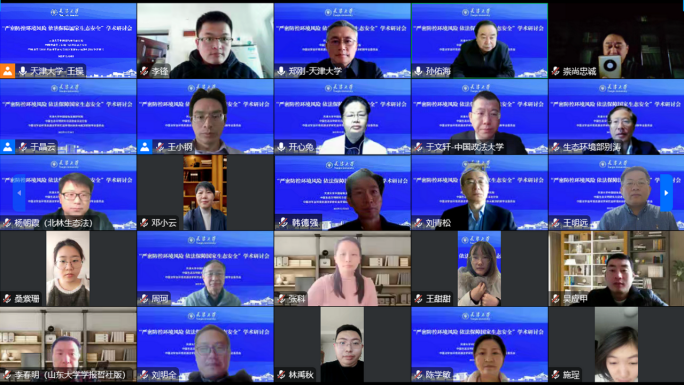 (通讯员王操 摄影于晶云)2022年12月24日,由天津大学中国绿色发展研究院、中国生态文明研究与促进会法治分会和中国法学会环境资源法学研究会环境纠纷多元解决机制专业委员会联合主办的“严密防控环境风险 依法保障国家生态安全”学术研讨会在天津大学法学院举行。来自全国政协、中国法学会、生态环境部、最高人民法院、中国生态文明研究与促进会、天津大学、湖南大学、中国政法大学、浙江工商大学、复旦大学、清华大学、北京航空航天大学、福州大学、武汉大学、西北政法大学、北京大学、中南财经政法大学、重庆大学、东南大学以及《东方法学》《山东大学学报(哲学社会科学版)》《地方立法研究》《环境保护》《环境经济》《中国生态文明》《南京工业大学学报(社会科学版)》《天津大学学报(社会科学版)》等单位的一百五十多名专家学者通过线上线下相结合的方式共同研讨防控环境风险与保障国家生态安全的理论与实践问题。