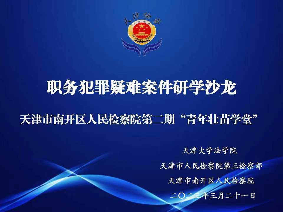 为认真贯彻落实习近平法治思想、党的二十大精神和教学实践相结合办学理念,法学院领导高度重视,亲自部署,2023年3月21日,天津大学法学院、天津市人民检察院第三检察部、天津市南开区人民检察院联合主办南开区人民检察院第二期“青年壮苗学堂”暨职务犯罪疑难案件研学沙龙。天津大学法学院刘霜教授、天津市南开区人民检察院副检察长张越、天津市人民检察院第三检察部副主任侯倩、天津大学法学院博士研究生仝帅、硕士研究生魏铭、天津市人民检察院、一分院、二分院、河北院、静海院、武清院、南开院职务犯罪检察条线的业务骨干、干警代表以及天津大学法学院刑法专业的硕士博士研究生参加了此次活动。