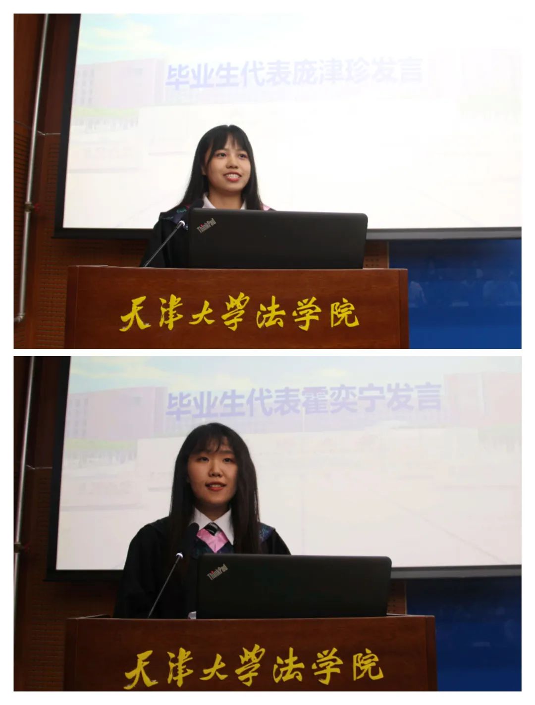 毕业生代表庞津珍同学和霍奕宁同学发言。毕业后,庞津珍将赴同济大学继续深造,霍奕宁将赴甘肃省宕昌县成为一名支教教师。她们回顾了四年间在专业学习、学科竞赛、课外实践和志愿服务等活动的满满收获,对学院老师的指导、支持和帮助表示感谢,对即将离别表示不舍,并为学院和老师送去美好的祝愿。她们代表毕业生表态,会把小我融入大我,把青春融入国家建设,坚定理想,勇毅前行,不负母校期望。