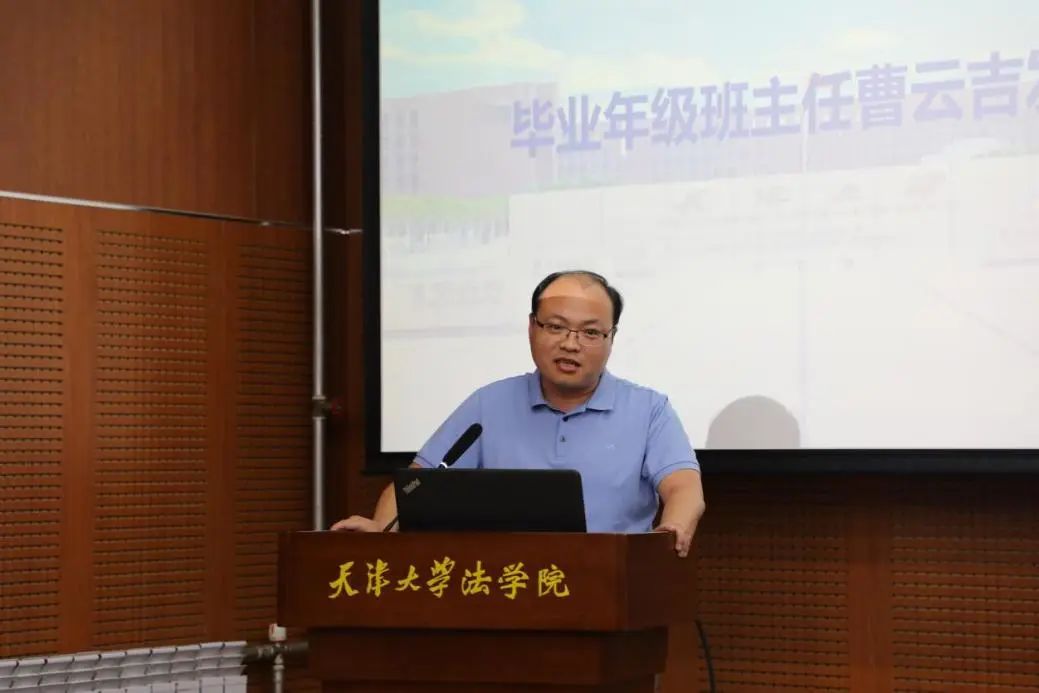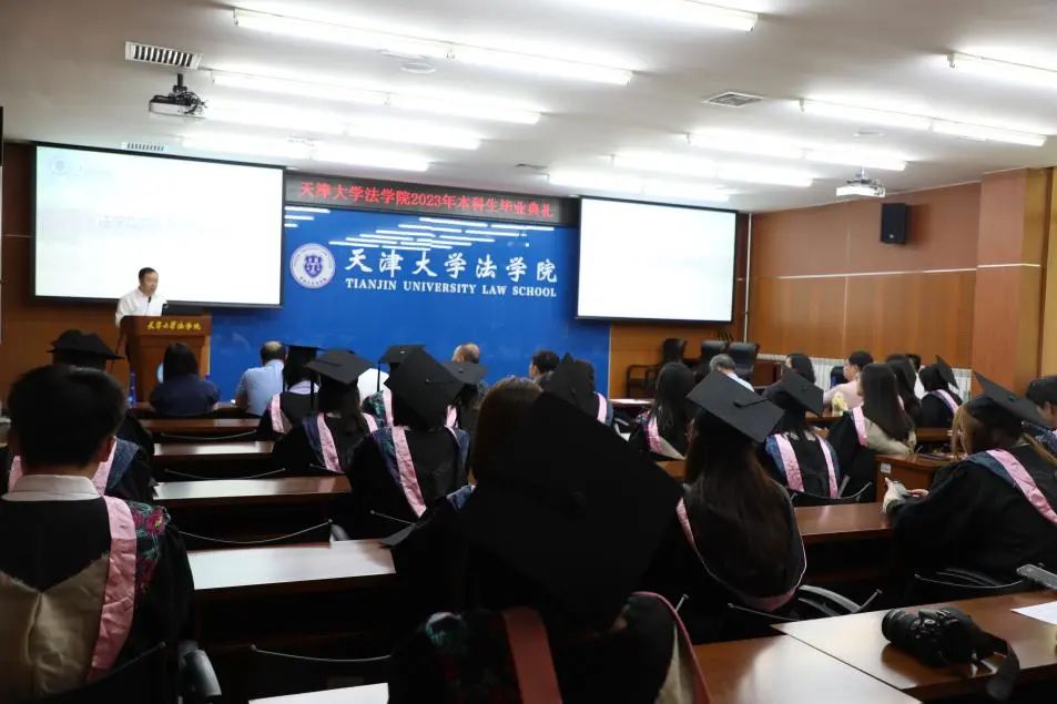 孙佑海院长讲话。他对学院2019级全体本科生顺利毕业表示祝贺,向关心、陪伴他们成长的亲人、师长和同学们表示感谢。他指出,本届毕业生的四年大学生活,多数时间面临着疫情的挑战,但大家选择行动与担当,学院师生上下同心、双向奔赴、砥砺前行,克服各种障碍与困难,使北洋法学薪火相传。他对毕业生提出四点希望,一要做“有理想”的新时代好青年。青年作为国家和民族中的先进集体,青年有理想有担当,国家和民族才有希望。天津大学作为中国第一所现代大学,法科作为最早的四大专业之一,天大法学培养出的学生应当树立远大理想,不负时代期望。二要做“肯奋斗”的新时代好青年。幸福是奋斗出来的,青年人要“自找苦吃”,做科研时要吃得了科研的苦,工作后要吃得了工作的苦,步入社会要吃得了生活的苦。三要做“敢担当”的新时代好青年。他鼓励同学们在面对前进路上的困难时,要发扬敢于奋斗、敢于担责、时不我待的精神,向张太雷、王宠惠等优秀校友学习。四要做“守规矩”的新时代好青年。面对诱惑要坚守法律红线,作为党员、团员要遵守党团纪律,人与人的交往要秉持友善观念,为人处世要常怀感恩之心。他表达了对于同学们成长成才的殷切期望,希望同学们在临别之际可以走走校园、参观院史馆,再次感受这个温暖的家,欢迎同学们常回家看看。