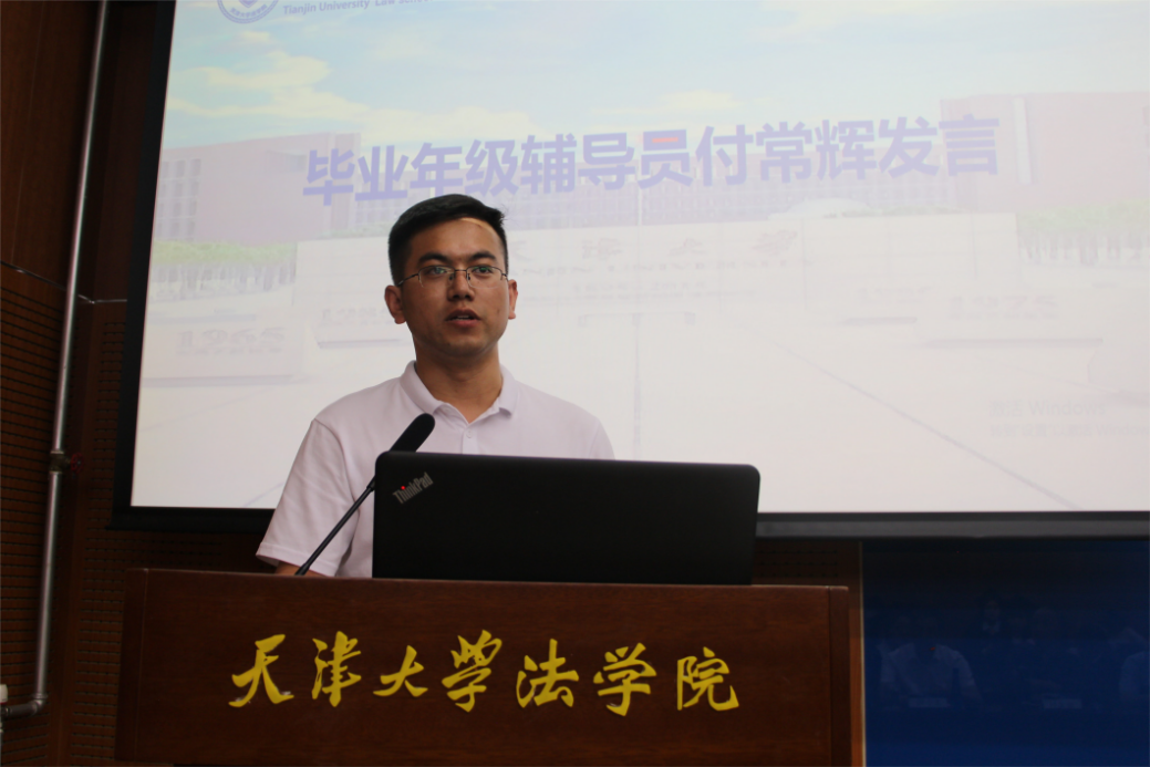 辅导员付常辉发言。他回忆了与同学们在大学共同成长的美好时光,表达了对同学们不舍之情。同时,结合工作感受,为同学们踏入新征程提出几点建议:要坚持学习,永葆学习的心态,运用好自己在学校学的专业知识,勇于面对挫折;要懂得尊重,善待他人就是善待自己;要学会感恩,对他人提供帮助要心怀感恩,积极回报社会。