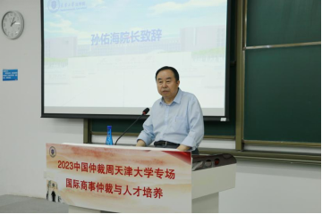 天津大学法学院院长孙佑海教授致辞。孙院长首先向来宾介绍了天津大学法学院的悠久历史与近期发展。他指出,国际商事仲裁是公正高效解决国际商事纠纷的一个重要途径,也是优化中国营商法治环境的有效途径。在当下日趋激烈的综合国力竞争中,涉外法治人才越来越成为推动经济社会发展的战略性资源,坚持统筹推进国内法治和涉外法治、加快中国的国际商事仲裁中心建设离不开涉外法治人才的培养。法学院作为教育培养社会主义涉外法治人才的第一阵地,一直致力于相关培养和建设,2021年在天津大学法学院挂牌成立涉外律师学院,今年与三亚凤凰公证研究院、中国国际经济贸易仲裁委员会天津国际经济金融仲裁中心签署深度合作协议,为培养更多复合型、高素质涉外法律服务专业人才开辟新的路径。