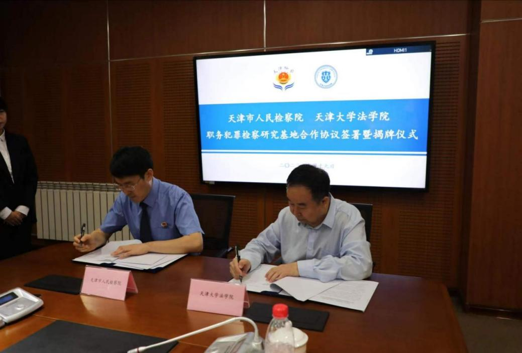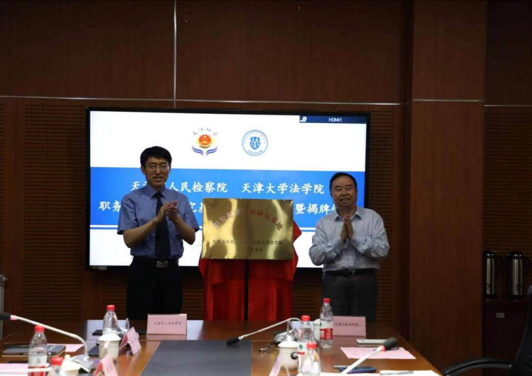 (通讯员:宋俞静、张昊)9月19日,天津市人民检察院与天津大学法学院职务犯罪检察研究基地合作协议签署暨揭牌仪式在天津大学法学院成功举行。市检察院党组成员、副检察长王建军,市检察院第三检察部主任施长征,市检察院第三检察部四级高级检察官陈赛、骆成及检察官助理曲文博参加仪式。天津大学法学院院长孙佑海,副院长杨健,法学院教授、基地负责人刘霜,法学院副教授孙皓,法学院副教授李倩,法学院副教授杨宁等学院师生三十余人出席活动。市检察院党组成员、副检察长王建军与天津大学法学院院长孙佑海共同为职务犯罪检察研究基地揭牌。仪式由市检察院第三检察部主任施长征主持。