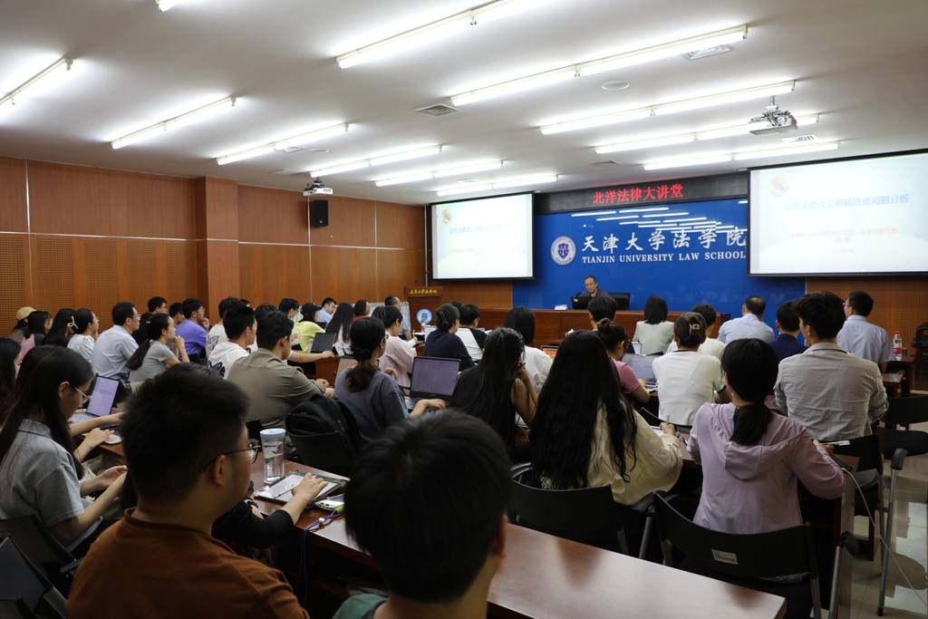 (通讯员 李冰琦)2023年9月22日,中国社会科学院学部委员、法学研究所研究员陈甦教授莅临天津大学法学院“北洋法律大讲堂”,本次讲座主题为“公司法修订草案三审稿热点问题分析”。法学院近百名师生聆听了讲座。讲座由天津大学法学院党委书记管虹主持。管虹书记首先对陈甦教授的到来表示热烈的欢迎,并对陈甦教授进行了介绍。
