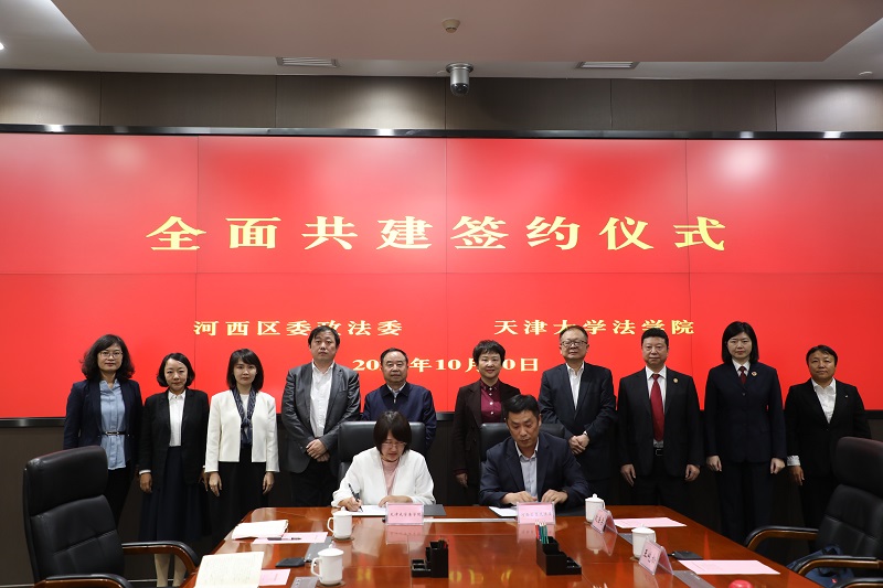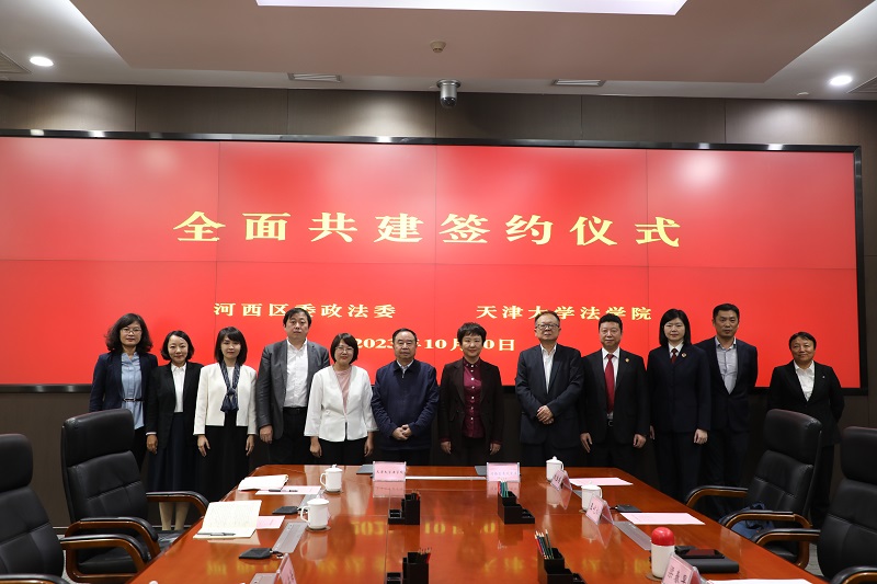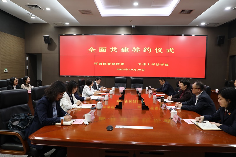 (通讯员 郭金石)2023年10月30日,天津大学法学院院长孙佑海,党委书记管虹,副院长杨健,党委副书记杨漫路,副院长于艳春,副院长杨雅婷等师生代表16人赴天津市河西区委政法委调研交流。双方在河西区政府二号楼举行全面共建签约仪式。河西区委副书记梁春早,区委常委、政法委书记曹晓阳,区法院院长王屹松,区检察院代检察长刘家卿,区委政法委分管日常工作的副书记陈辉、区法院副院长孙政,区检察院政治部主任张金强,公安河西分局副局长王朝阳,区司法局副局长陈辉,以及区委政法委、区法院、区检察院、公安河西分局、区司法局干警代表出席会议。签约仪式由曹晓阳主持。