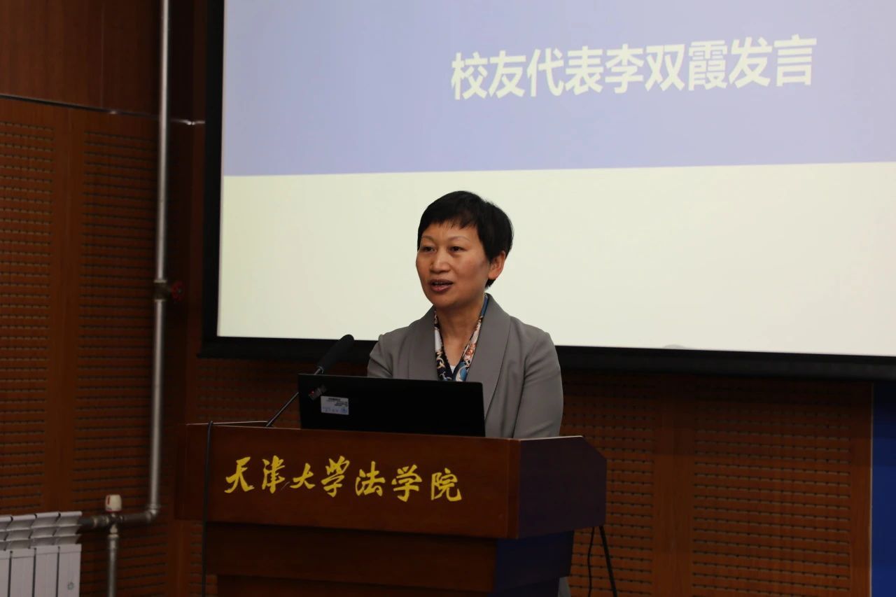 杰出校友代表李双霞发言。李双霞校友毕业于天津大学94级经济法专业本科,作为明德投资创始人,创立明德投资以来,先后联合创立安泰复材、新碳烯能、至微新能源、氢联世纪、光氢能源以及主导投资了氢蓝时代、氢璞创能、新氢动力、煦达新能源等新能源新材料公司,有着非常丰富的实务经验与卓越的事业成果。李双霞学姐为即将毕业的法学院同学们赠送了四句人生感悟。一是要怀有赤子之心,内心要始终保持对生命的热爱和对世界的善意。二是要脚踏实地,做任何事要有始有终,不要总想走捷径,要相信这个世界终将抱以公平。三是要保持开放心态,在职业的倦怠期耐得住寂寞,当机会来临时要牢牢抓住。四是要学会坚强,要坚信迈过生活的沟坎之后,一定会有不一样的风景。最后,李双霞学姐祝福学弟学妹们在毕业之际勇敢面对未来的挑战,展现出更加卓越的自己。