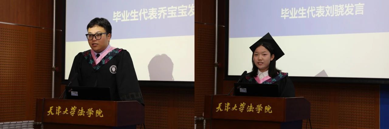 本科毕业生代表乔宝宝、刘骁同学发言。毕业后,乔宝宝同学将作为定向选调生前往安徽省纪委监委工作,刘骁同学选择前往新疆布尔津县成为一名支教老师。回顾四年的天大时光,两位同学都在天大法学院“崇法厚德,致公天下”的院训熏陶下,实现了能力和素质的蜕变。他们代表毕业生表态,未来无论身处何处,身体将永远流淌北洋法学的热血。