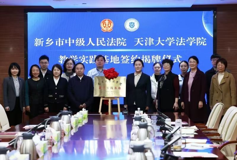 (通讯员 杨雅婷)11月24日,天津大学法学院孙佑海院长、管虹书记一行赴新乡市中级人民法院开展校院合作。双方共同签署“新乡市中级人民法院——天津大学法学院”卓越法治人才联合培养合作框架协议,并举行“教学实践基地”揭牌仪式。天津大学法学院院长孙佑海,新乡中院党组书记、院长王静出席仪式并讲话。新乡中院党组成员、政治部主任徐明慧进行致辞,审判委员会专职委员侯贵枝主持仪式。管虹书记代表天津大学法学院签署共建协议,孙佑海院长与王静院长共同揭牌。天津大学法学院党委副书记杨漫路、副院长杨健、于艳春、杨雅婷,院长助理田亦尧及新乡法院部分干警代表参加签约揭牌仪式。