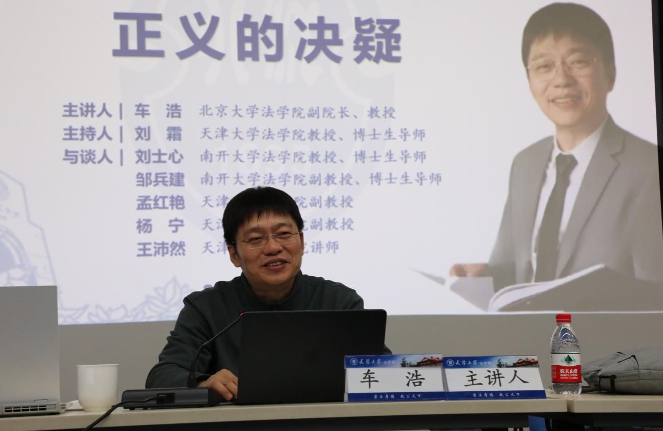 (通讯员:周新宇 摄影:田海玉)2024年12月1日,“长江学者奖励计划”特聘教授,“全国十大杰出青年法学家”北京大学法学院车浩教授做客北洋法律大讲堂。车浩教授以《正义的决疑》为主题,围绕“何为正义,如何决疑”,深度剖析法学核心命题。此次讲座由天津大学法学院主办,天津大学法制办和天津市职务犯罪检察研究基地协办。南开大学、天津师范大学、天津财经大学、天津商业大学法学院理论专家和天津市法院、检察院系统的法官、检察官莅临出席。天津大学法学院院长孙佑海教授、副院长杨健教授,刑法学科全体老师和学生150余人聆听讲座。报告会由刘霜教授主持。