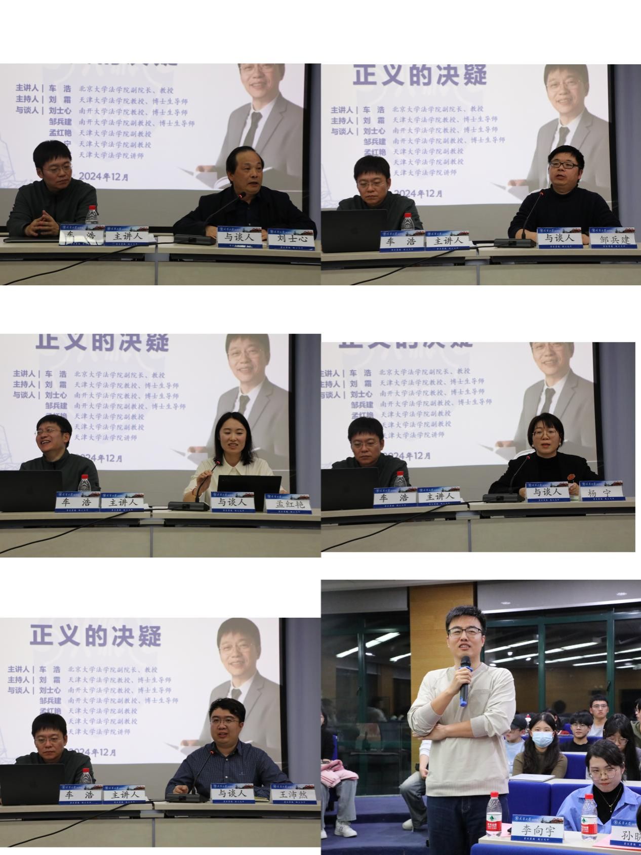 在与谈环节,与谈嘉宾南开大学法学院刘士心教授、邹兵建副教授,天津大学法学院杨宁副教授、孟红艳副教授、王沛然老师分别从问题性思考的重要性,体系性思考与问题性思考的先后顺序,实践中如何贯彻正义决疑,丰沛想象力与勇气对法学学习的重要性等方面与车浩教授展开了积极的探讨。同时几位与谈人都对车浩教授的讲授表达了感谢并做出高度评价。在提问环节,参与讲座的实务界人士和天津大学法学院学生都踊跃参加,积极提问。车浩教授进行了耐心、细致地解答,也让与会人员更加深刻、具体地认识到决疑术如何运用于个案之中。