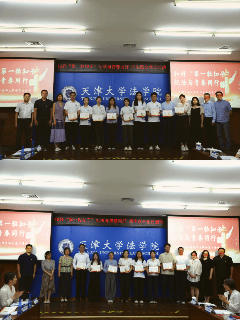 (通讯员:代一然 摄影:周泓佚)青春逢盛世,纪法正当时。为深入贯彻中央八项规定精神,引导青年学子筑牢思想防线,培养知法、守法、护法的法治人才,6月24日,法学院于332会议室开展“扣好第一粒扣子,纪法与青春同行”师生联合党日活动。本次活动由法学院教工第二党支部、博士生第一党支部和2022级硕士生第二党支部共同开展,是属于2025届硕博毕业生党员的“最后一课”。天津大学党委常委、副校长郑刚,天津大学教师工作部部长、人事处处长马德刚,天津大学法学院院长孙佑海、党委书记管虹及学院领导班子成员出席本次活动,活动由博士生第一党支部书记赵旖鑫主持。