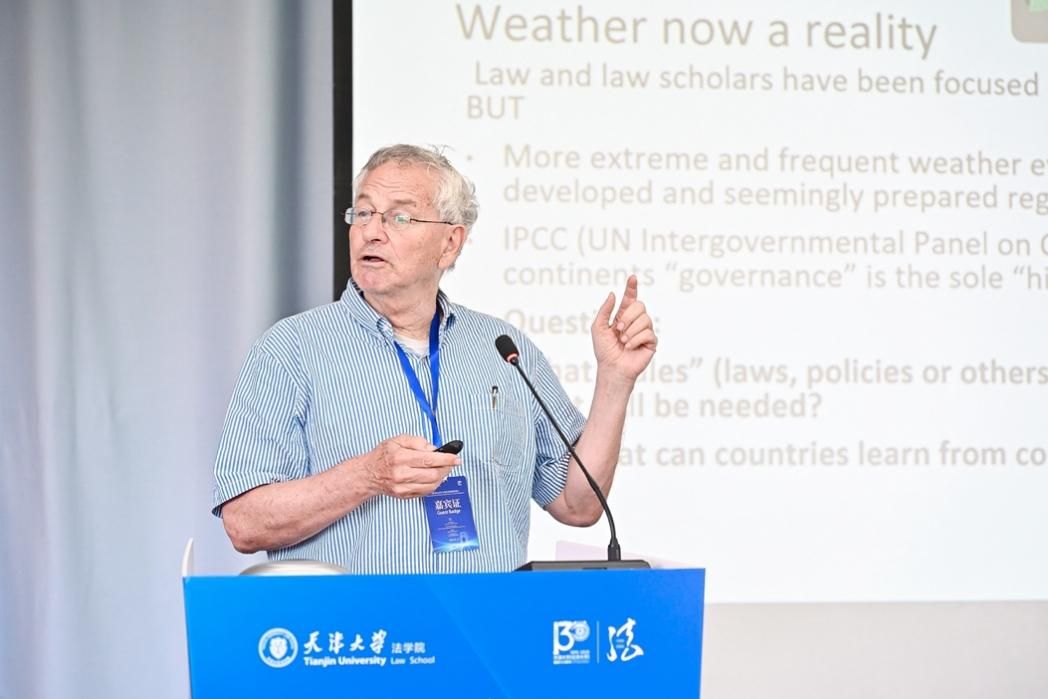 天津大学法学院外籍教授丹·古特曼(DANIEL GUTTMAN)作题为《区域和地方气候影响治理(适应):尚待制定规则的全球性挑战》的主旨发言。他指出全球气候政策长期聚焦于减排,但极端天气事件频发已成为现实,地方层面的适应治理亟需加强,并进一步呼吁各国加强比较研究与国际合作,制定更加系统、前瞻和可执行的法律与政策框架,支持地方提升气候适应能力。