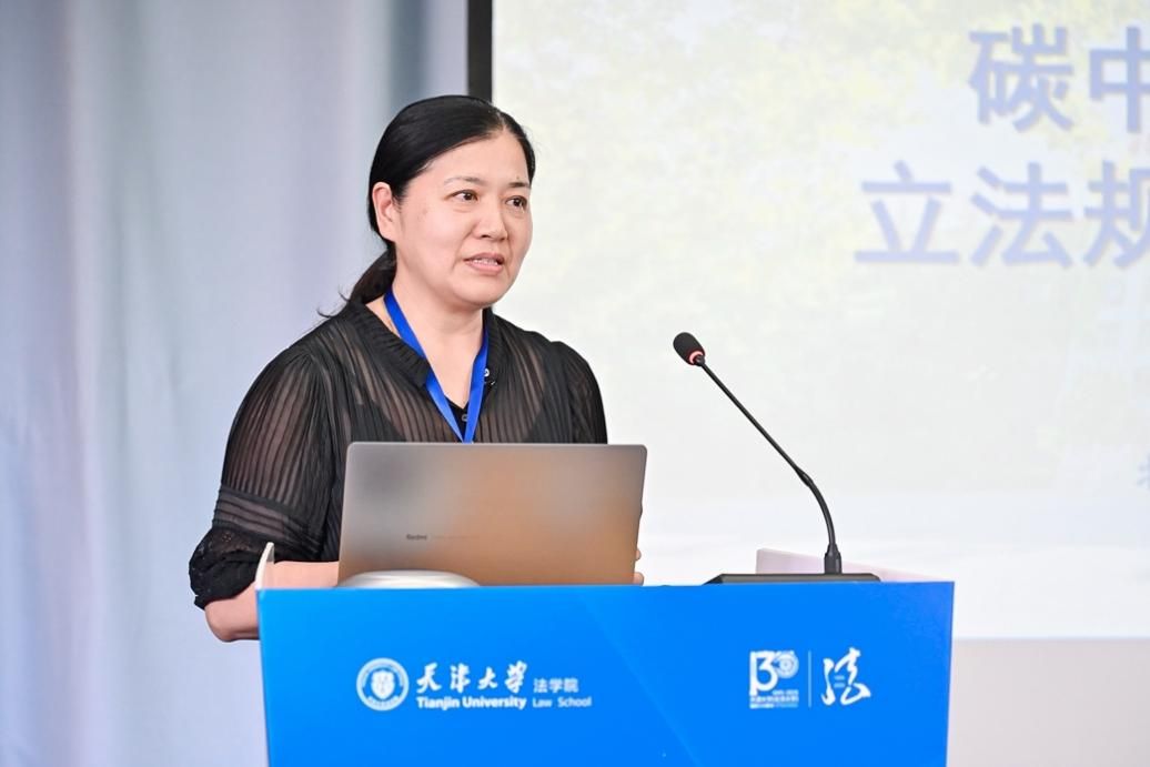 北京航空航天大学法学院教授杜群作题为《碳中和实施法的立法规制和制度构建》的主旨发言。她指出在构建碳中和实施法的制度体系时,应将其立法规制特征转化为法律制度的立法表达方案,具体制定目标导向、过程控制与结果考评、绿色低碳公正过渡保障的专门性法律制度,项目碳评价、碳汇生态产品价值实现、绿色低碳转型资金保障的嵌合性法律制度,以及后果性责任追究制度。