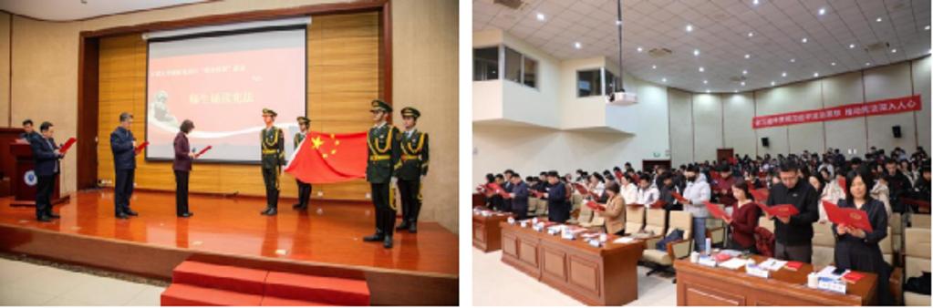 校党委常务副书记雷鸣在讲话中回顾了学校在法治建设与育人实践中取得的系列成效,并围绕“学习宣传贯彻习近平法治思想,推动宪法深入人心”主题,强调要深刻把握习近平法治思想的指导意义,将宪法教育融入育人体系,创新形式载体,培育校园法治文化,全体师生应自觉成为习近平法治思想的传播者和宪法精神的践行者。