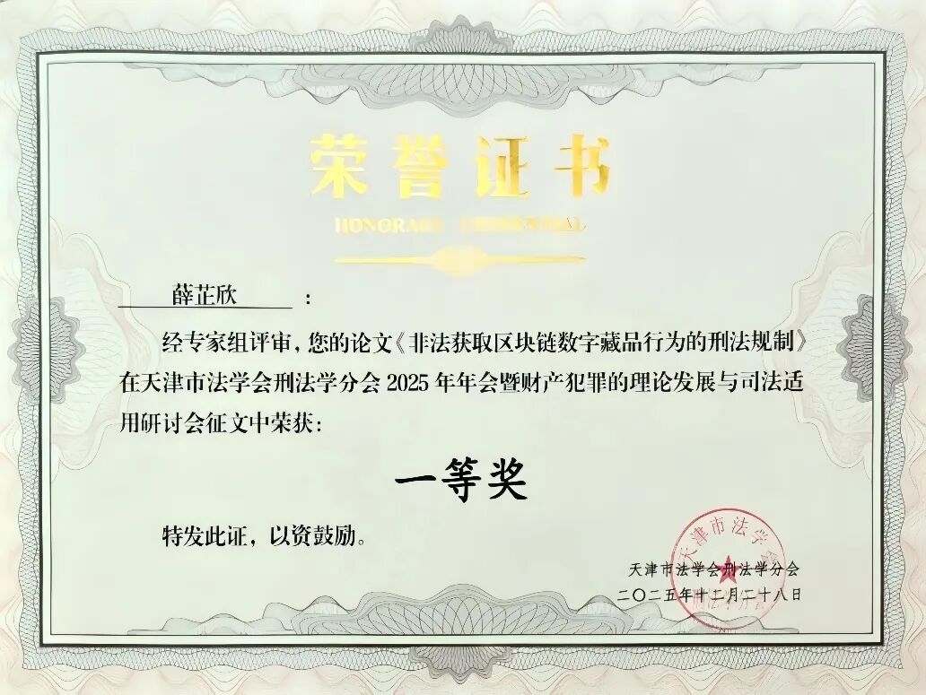 法学院研究生薛芷欣的论文《非法获取区块链数字藏品行为的刑法规制》在年会征文中荣获一等奖。