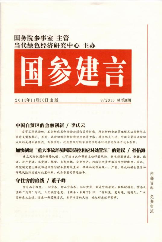 《国参建言》由国务院参事室主管,当代绿色经济研究中心主办,其功能是参政议政、建言献策,立足中国国情、关注中国的现实问题,征集社会各学科领域的权威专家所提出的政策建议。《国参建言》主要上报给国务院总理、副总理,国务委员以及国务院部门,为国务院有关政策制定、重大决策、战略规划提供政策咨询服务。