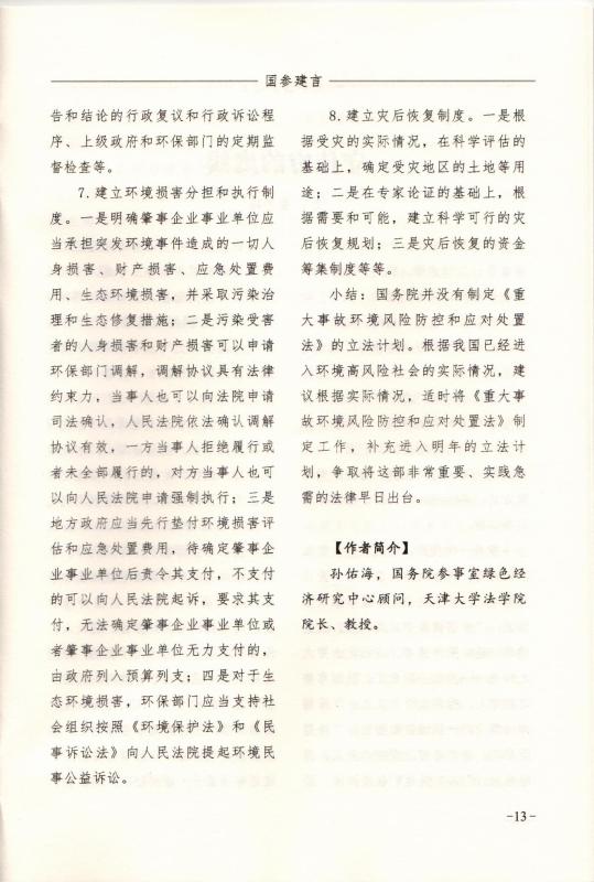 本站讯(通讯员 郭金石)近日我校获悉,国务院参事室绿色经济研究中心顾问、天津大学法学院院长孙佑海教授所撰写的《加快制定“重大事故环境风险防控和应对处置法”》报告被2015年第8期《国参建言》刊发,这是我校学者政策建议首次被《国参建言》采纳。