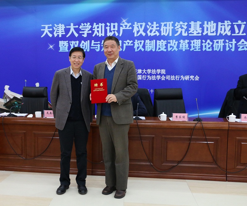 李家俊校长、贺化副局长、齐成喜局长、元英进副校长、孙佑海院长、李明德主任共同为天津大学知识产权法研究基地揭牌。李家俊校长向李明德教授颁发了研究中心主任聘书,向俞风雷副教授颁发了研究中心执行主任聘书。
