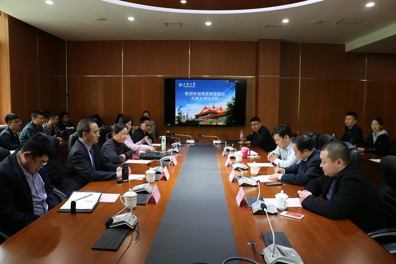 (通讯员 吕晓薇 郭金石)4月29日,中国政法大学校长黄进教授到访天津大学法学院并与学院师生座谈。天津大学法学院院长孙佑海,法学院党委副书记、副院长李明,法学院国际法教研组组长吕斯轩,学院于亮副教授、王蕾凡老师以及研究生和本科生50余人出席座谈会。