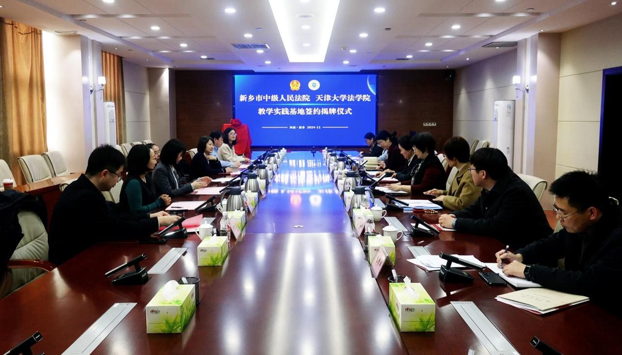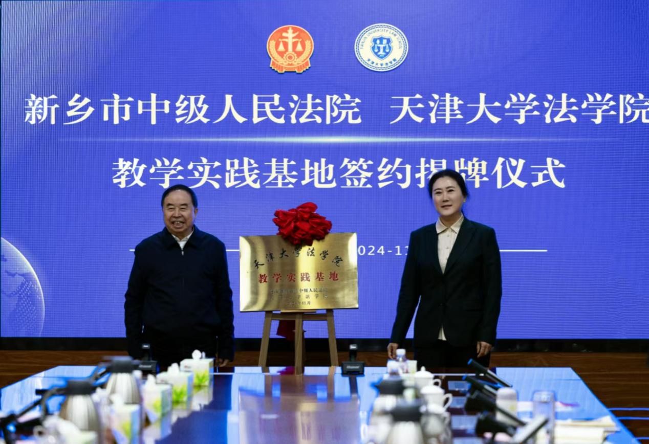 (通讯员 杨雅婷)11月24日,天津大学法学院孙佑海院长、管虹书记一行赴新乡市中级人民法院开展校院合作。双方共同签署“新乡市中级人民法院——天津大学法学院”卓越法治人才联合培养合作框架协议,并举行“教学实践基地”揭牌仪式。天津大学法学院院长孙佑海,新乡中院党组书记、院长王静出席仪式并讲话。新乡中院党组成员、政治部主任徐明慧进行致辞,审判委员会专职委员侯贵枝主持仪式。管虹书记代表天津大学法学院签署共建协议,孙佑海院长与王静院长共同揭牌。天津大学法学院党委副书记杨漫路、副院长杨健、于艳春、杨雅婷,院长助理田亦尧及新乡法院部分干警代表参加签约揭牌仪式。