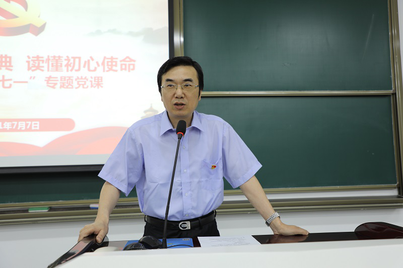 为进一步深化党史学习教育,深入学习习近平总书记在庆祝中国共产党成立100周年大会上的讲话,7月7日上午,法学院党委组织开展“七一”专题党课,由法学院党委书记杨欢主讲。法学院全体教师60余人参与学习,党课由学院党委副书记、副院长张昊主持。