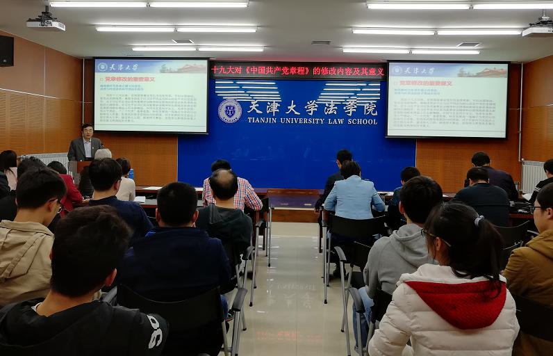 本站讯(通讯员 张丹)11月3日下午,法学院党委书记杨欢为学院师生党员讲授题为“十九大对《中国共产党章程》的修改内容及其意义”专题党课,法学院全体教工党员以及全体学生正式党员参加。