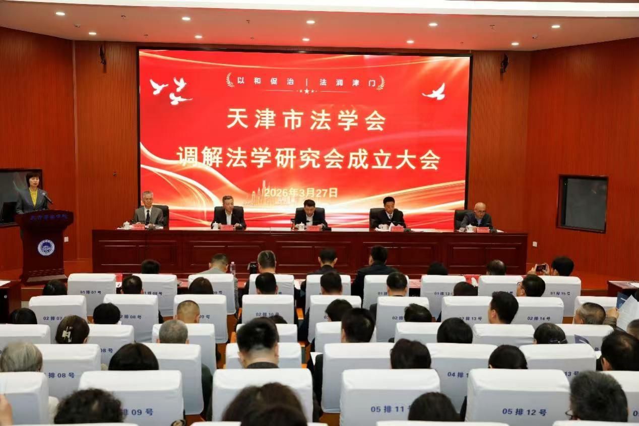 2026年3月27日下午,天津市法学会调解法学研究会成立大会在天津警察学院隆重召开。市委政法委副书记、市法学会党组成员、副会长胡志勇,市法学会党组成员、专职副会长张劲枫以及天津警察学院党委书记陈大勇,党委副书记、院长廉军,副院长王春东出席会议。来自全市高校、政法实务部门、基层调解组织的专家学者、实务骨干及研究会全体会员参加本次大会。