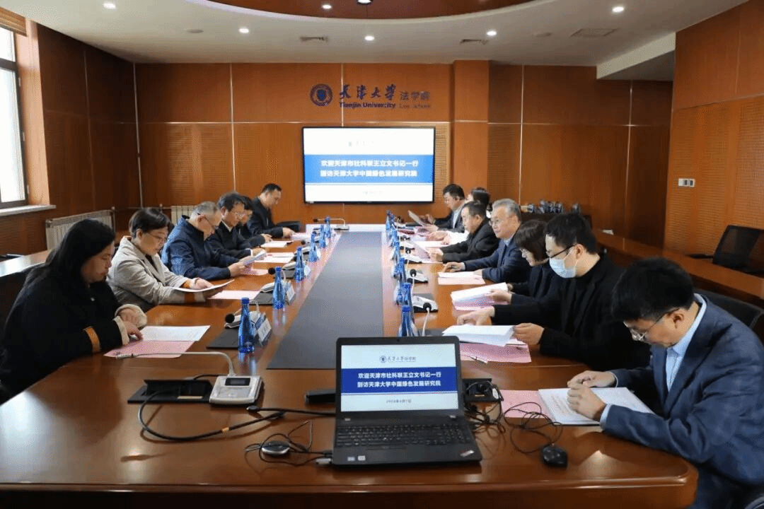 (通讯员 尹卓扬)2026年4月7日,天津市社科联党组书记、专职副主席、市委宣传部副部长王立文,市社科联党组成员、专职副主席张再生,社会组织部部长周进,智库工作部部长宁厚圃,社会组织部干部王雅琦,智库工作部干部周博文一行到访天津大学法学院和中国绿色发展研究院,调研天津大学中国绿色发展研究院建设情况。天津大学党委常委、副校长郑刚,天津大学法学院党委书记管虹,人文社科处处长、文科建设办公室主任杜慧滨,人文社科处副处长、文科建设办公室副主任刘俊卿,法学院副院长、教授杨健,法学院院长助理、教授薛杨,法学院英才教授、中国绿色发展研究院副院长王小钢等出席座谈。